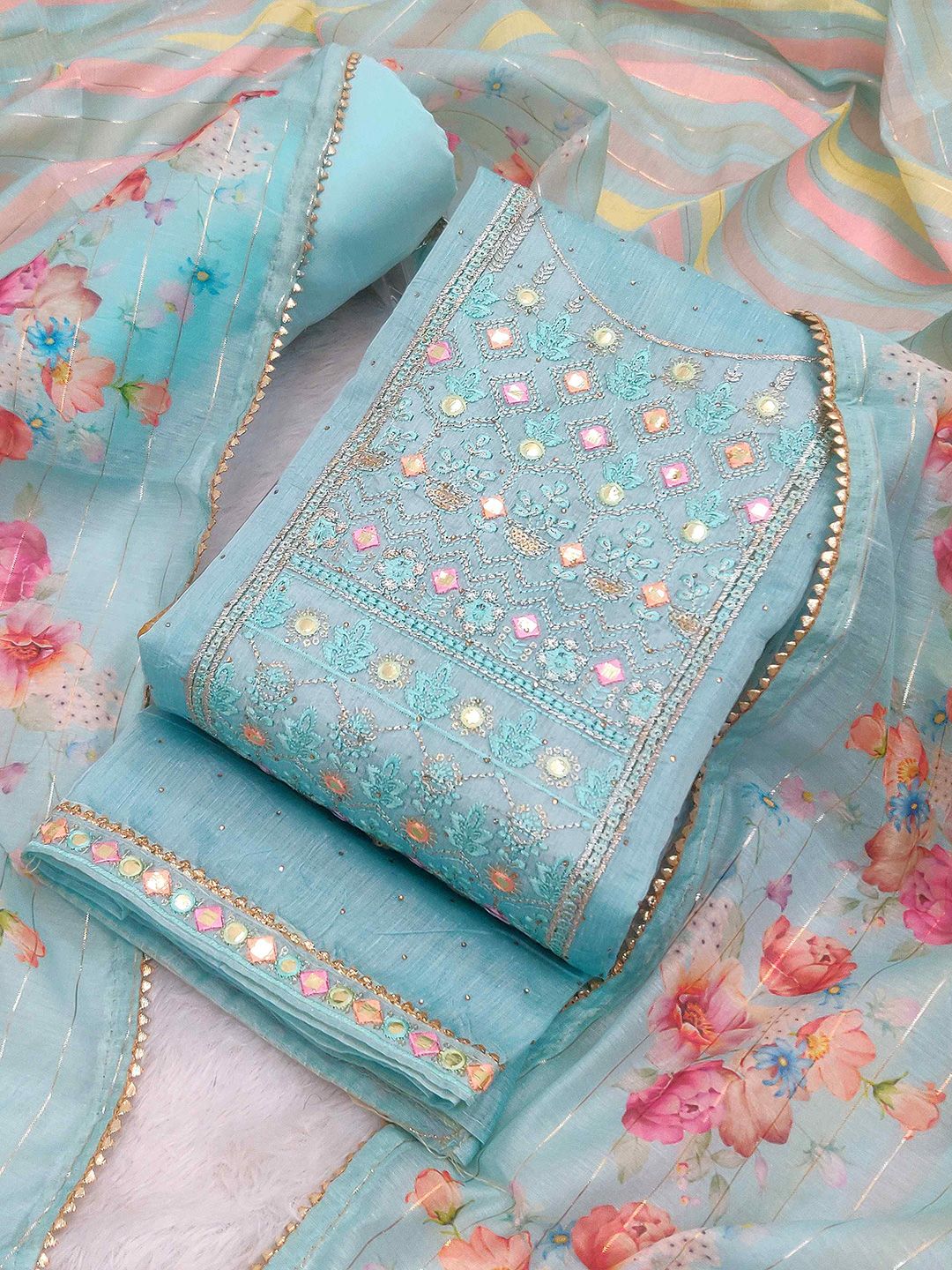 TAVAS presents this elegant Blue Dress Material crafted for Women. Made using premium Not Available, this outfit features a refined Not Available silhouette, a stylish Not Available neckline and Not Available. The Not Available hemline and Not Available length complete the look. Perfect for Festive wear.