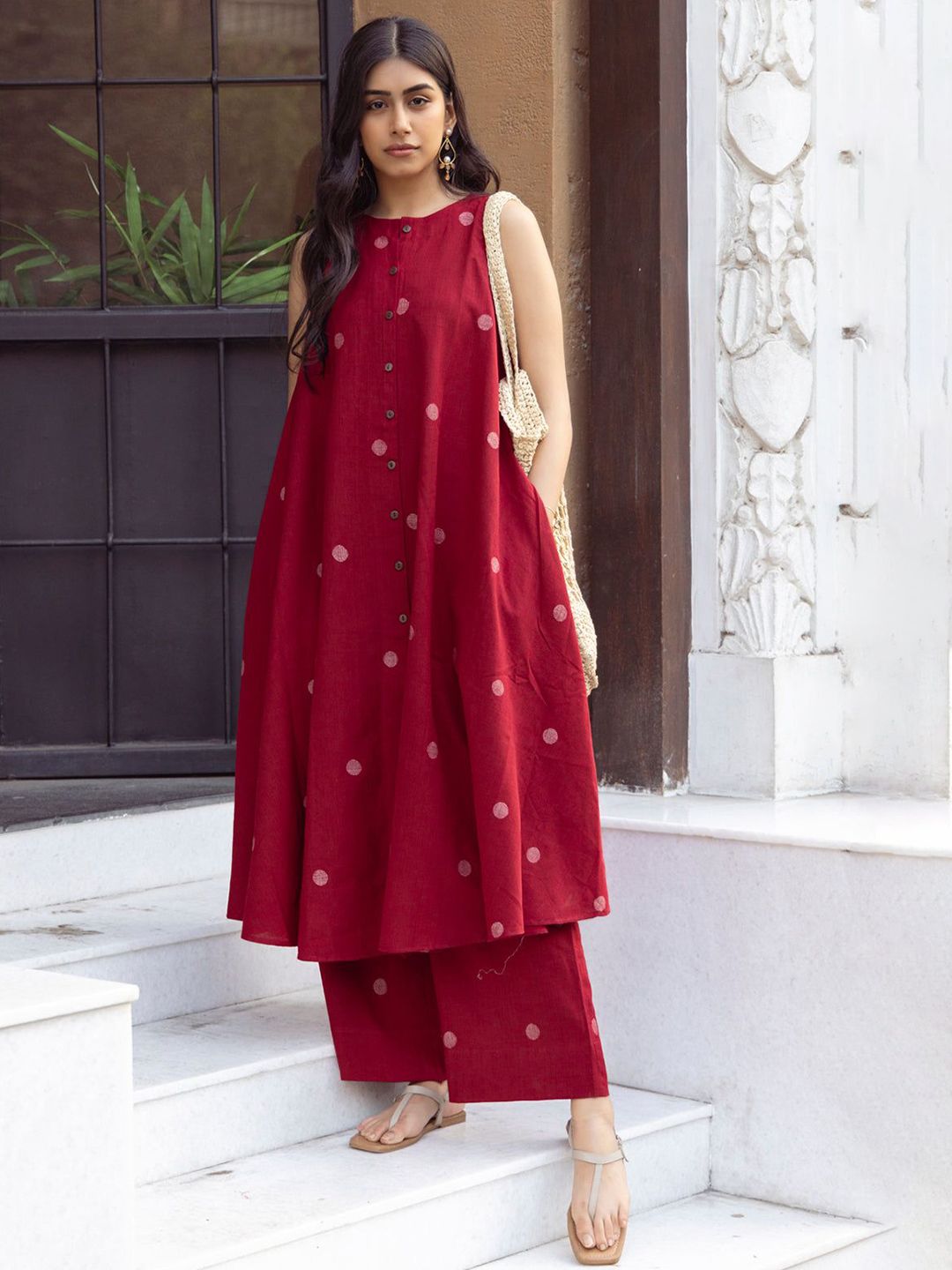 GoSriKi presents this elegant Red Kurta Sets crafted for Women. Made using premium Not Available, this outfit features a refined Not Available silhouette, a stylish Round Neck neckline and Sleeveless. The Not Available hemline and Not Available length complete the look. Perfect for Festive wear.